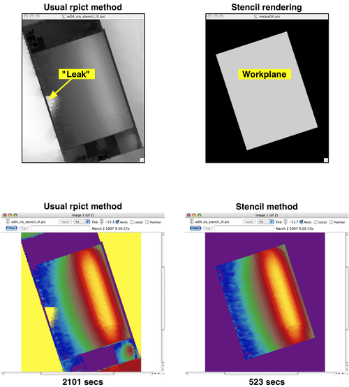Which worked first time. The lower two images in the PDF show the “usual rpict method” and the “stencil method” renderings set to the same falsecolor scale (in Photosphere). In addition to preventing leaks, the stencil method was four times faster. Both renderings were, of course, generated using the same ambient parameters – in this case: